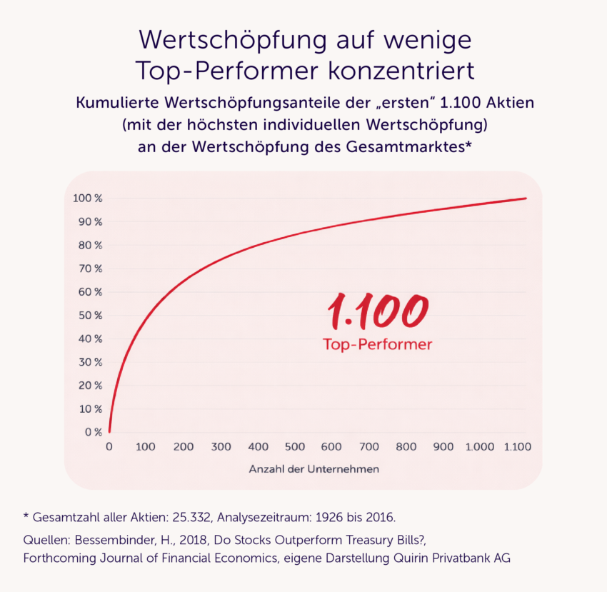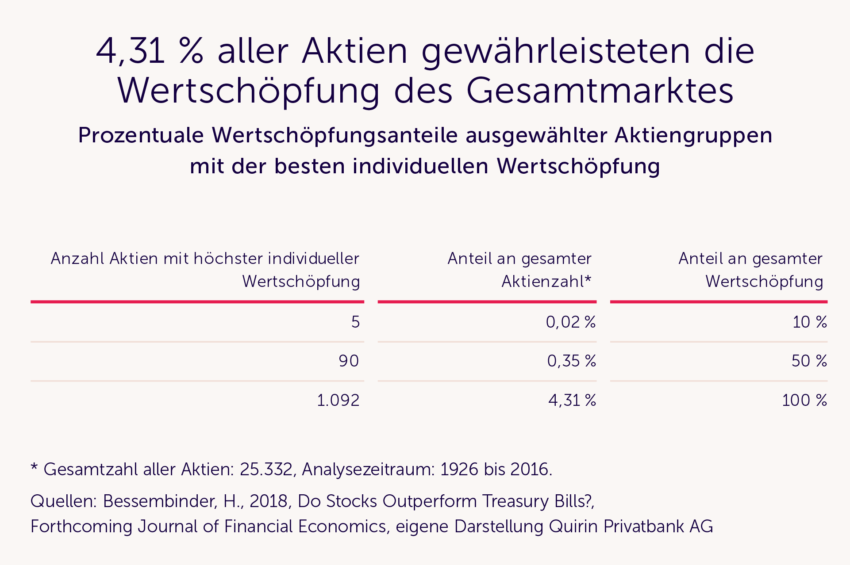 • Aktuelle Forschungsergebnisse bestätigen: Nur ein relativ kleiner Teil aller Aktien aus einem riesigen Anlageuniversum sorgt letztlich für eine insgesamt attraktive Marktrendite.