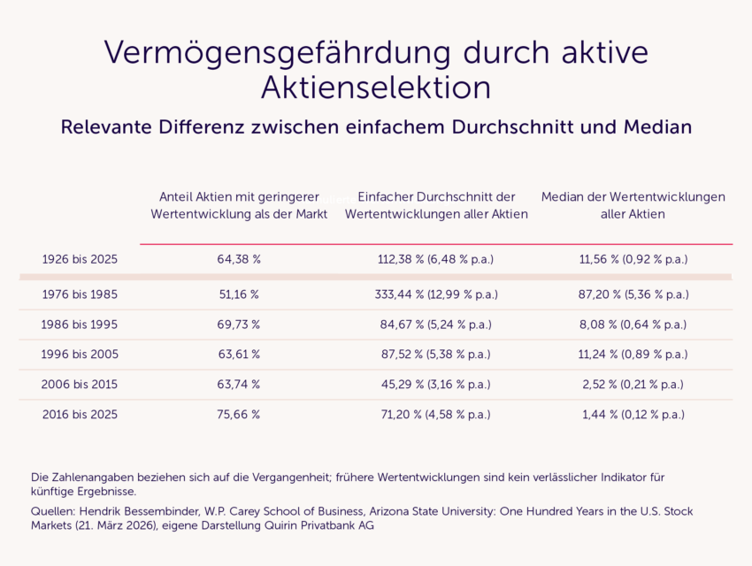Die Tabelle zeigt in der ersten Spalte für ausgewählte Zeiträume den prozentualen Anteil an Aktien mit einer Wertentwicklung unterhalb der Marktrendite. Mit Ausnahme der Jahre 1976 bis 1985 liegt dieser Anteil zwischen 60% und 70%, in den letzten zehn Jahren sogar deutlich darüber. Mit rund zwei Dritteln aller Aktien ist man somit auf der Verliererstraße und nur mit einem Drittel bei den Gewinnern.