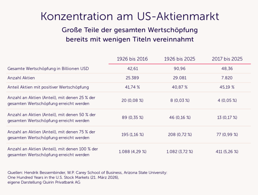 In den letzten neun Jahren ist dieser Wert auf knapp 91 Billionen angestiegen. Und nach wie vor konzentriert sich das auf eine kleine Anzahl: Waren es in den Jahren 1926 bis 2016 lediglich 89 von insgesamt 25.383 Aktien, mit denen bereits 50% der gesamten Wertschöpfung erzielt werden konnten, ging diese Zahl im neuen, bis 2025 reichenden Datensatz auf 46 Aktien (von insgesamt 29.081) zurück.